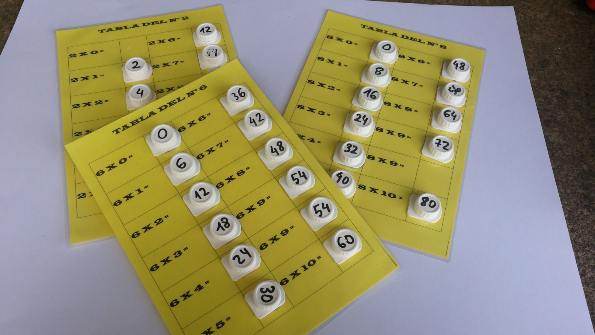 Practicamos a táboa de multiplicar, cun xogo de tapóns de elaboración propia. E mentres subimos as escaleiras, tamén as recordamos.
