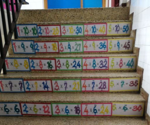 Practicamos a táboa de multiplicar, cun xogo de tapóns de elaboración propia. E mentres subimos as escaleiras, tamén as recordamos.