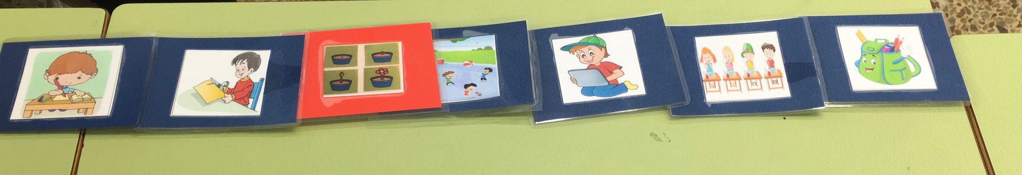 A clase ten colocados os pictos que se corresponden con cada unha das caixas Teacch, dentro de cada unha están as instruccións para actividade que hai que facer. Na mesa do alumno/alumna, poranse en orden os pictos das tarefas que ten que realizar ese día.