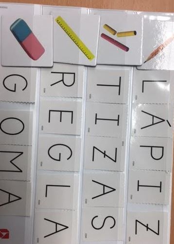 1.Ordenar o nombre coas letras en maiúsculas ( o botón indica a colocación da letra)2.Co dado de vogais xogamos a adiviñar por que vogal empeza cada imaxe (segundo a vogal collemos o debuxo).3.Vogais a fuga (ensinamos a leer apoiándonos na imaxe retirando nun principio só as vogais,e logo iremos sacando as consoantes segundo vaian aprendendo). 4. Lectura de imaxes, e asociación das mesmas segundo a letra pola que empecen. 5, Facemos descriminación visual entre grande pequeno e mediano. 6. Asociamos imaxen a cada palabra e separamola en silabas. 7. Construimos os puzzles coas fotos da xente máis cercana ao alumno, aprendemos o seu nome e descompoñemolo en sílabas. 8. Lemos con Bubela, transcribimos as maiúsculas os textos. 8. Miramos a imaxe e escollemos as letras e formas a palabra.